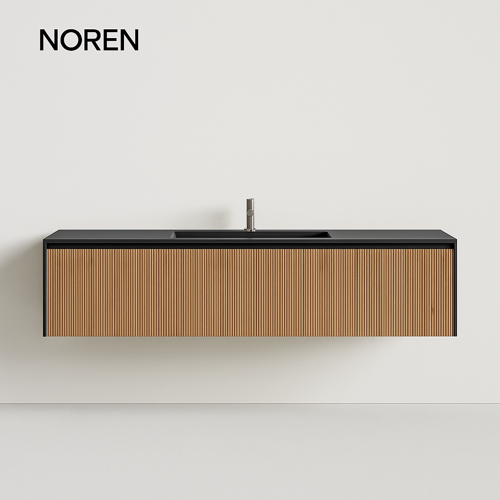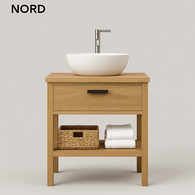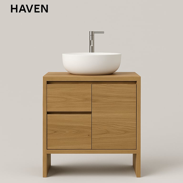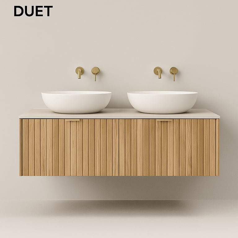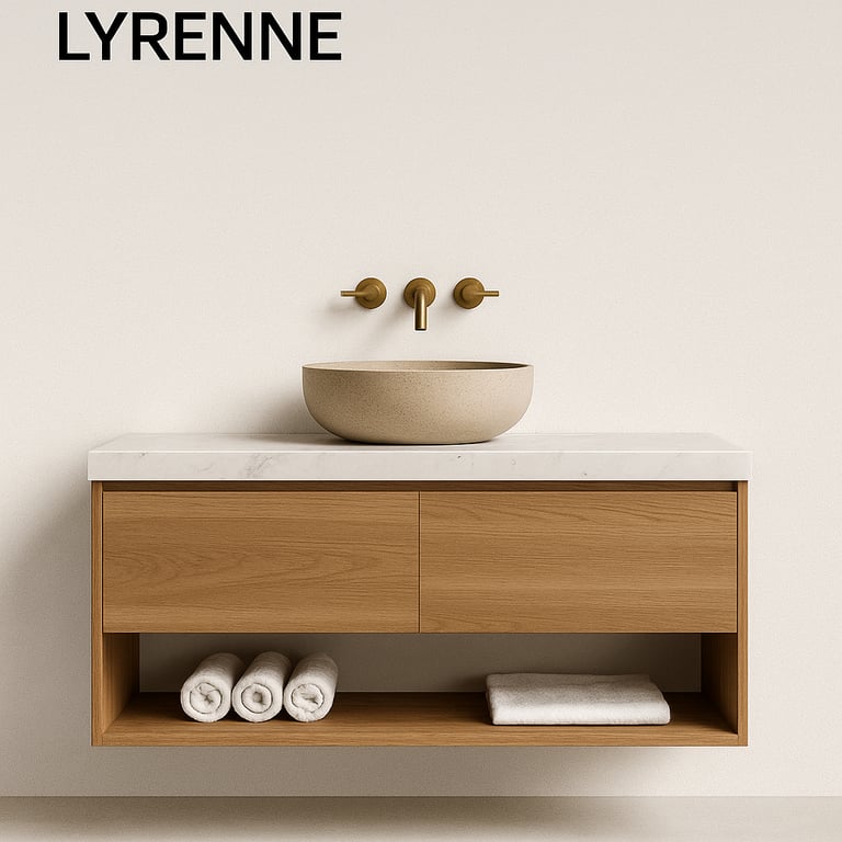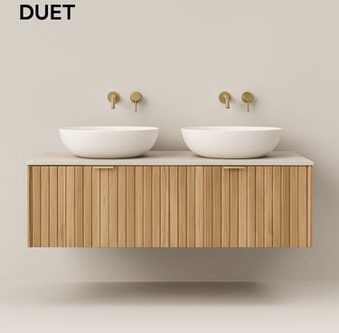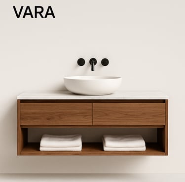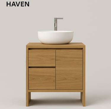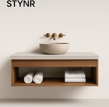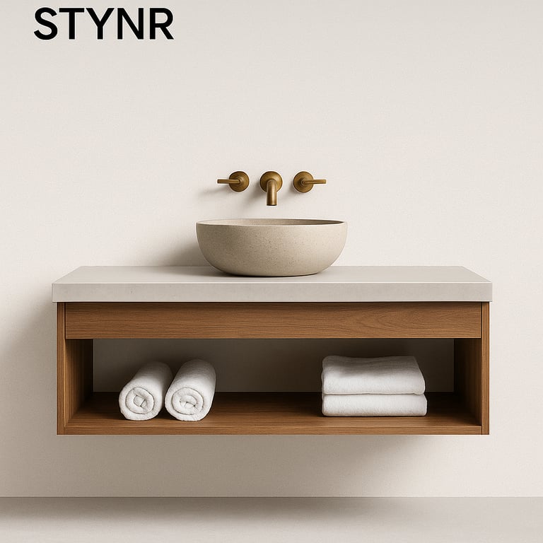 Discover the Vanities Collection by Stone Theory Studio — where natural teak wood and composite stone countertops merge into timeless, functional art.
